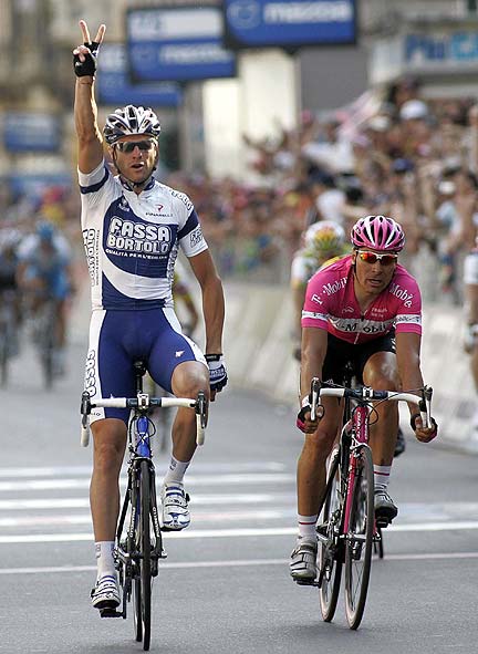 "Angel" is a fine choice for young riders. It serves as a metaphor for the ascent to the ranks of greatness. Note the confirmatory salute of Piepoli here. If you're close to a winning teammate at the finish, there's no rule that says you can't enjoy some of that victory pie as well. Not only does it showcase the strength of team unity, it also displays the unselfish character of a noble domestique. Bravo! [Slow Your Roll]
